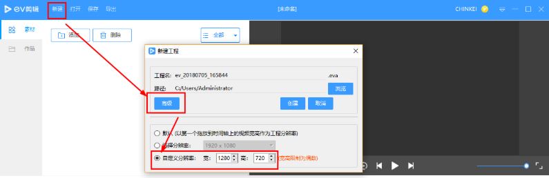 3、点击新建,点选“高级”,在自定义分辨率中填写“原尺寸”数值,然后点击确定,将素材添加到视频轨道即可。