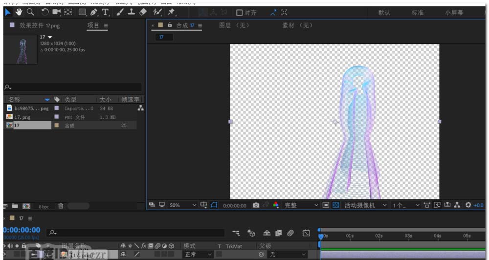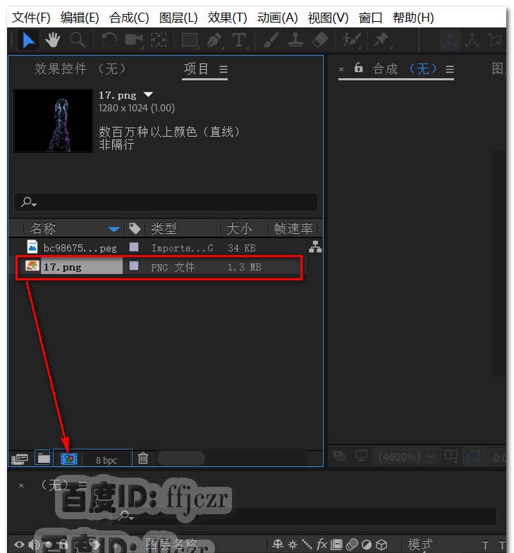 1、打开AE软件,从项目栏中双击或点右键选择导入文件;所导入的文件是一个带有透明背景的图片。将导入的图片拖到新建合成小图标上,以导入图片的规格创建一个合成。