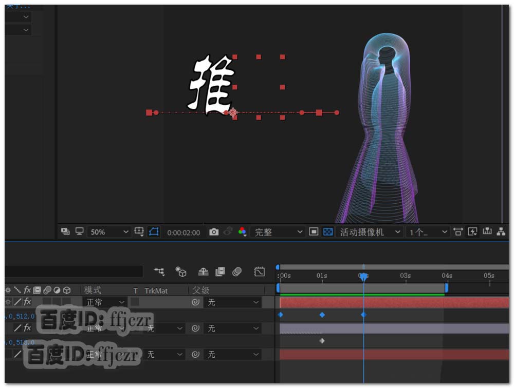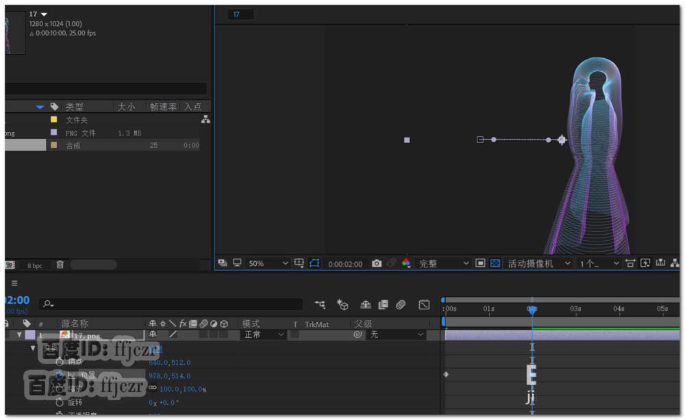3、给透明图片一个运动动画。展开图片层的列表,在时间为0时激活位置的关键帧,图形在显示中心;时间线为2时将图形移动到显示区的右边。