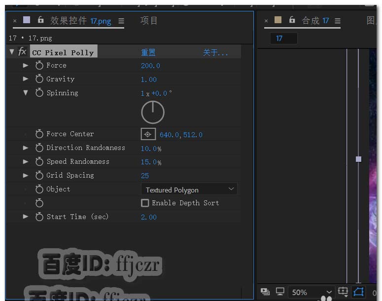 4、给图形层添加效果,模拟中的CC Pixe Polly;在效果控件栏中参数调整如下:Flrce 200,Gravity1,Start Time(sec) 2。这样就得到了图形向右位移2秒后爆炸的动画。