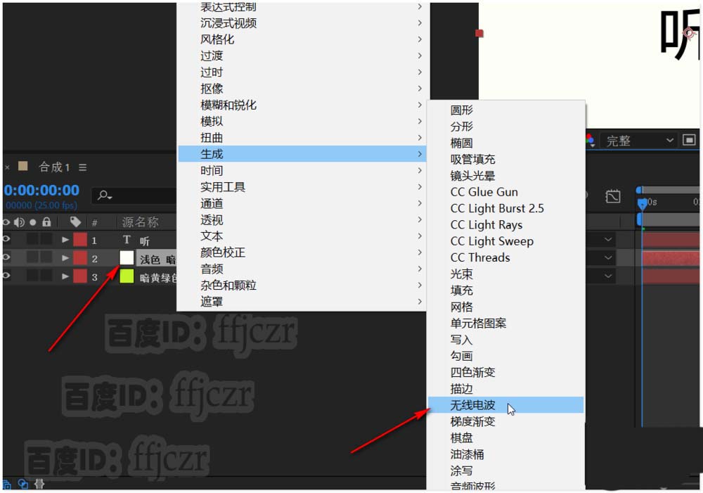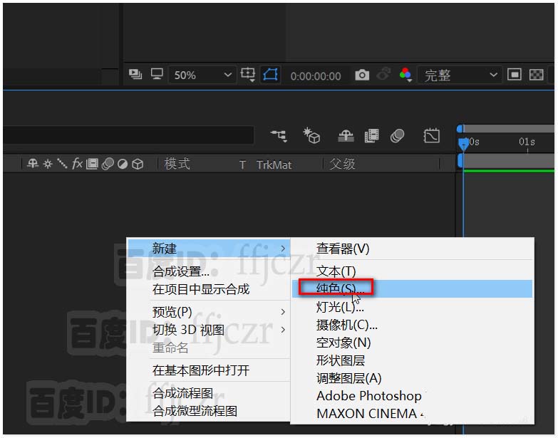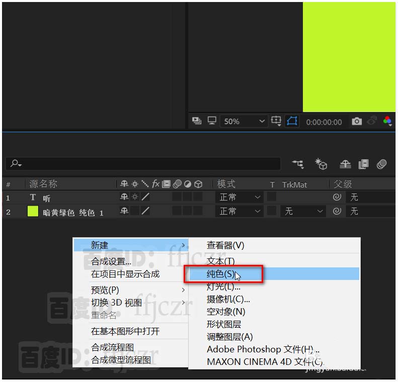 5、添加一个纯色层,作为无线电波的效果层。并将该层拖至文字层的下方。