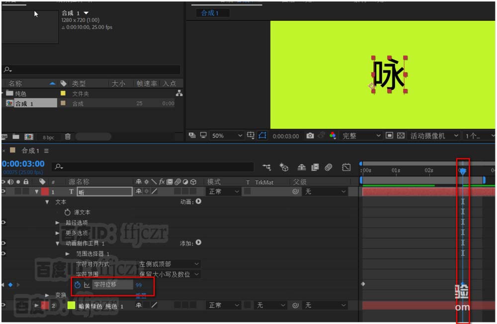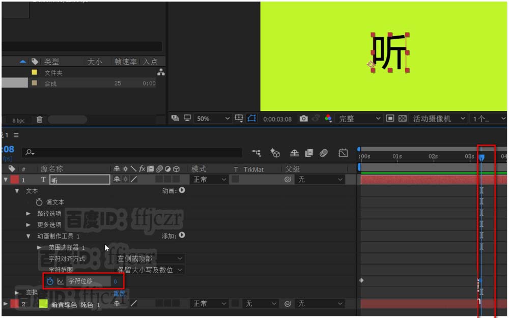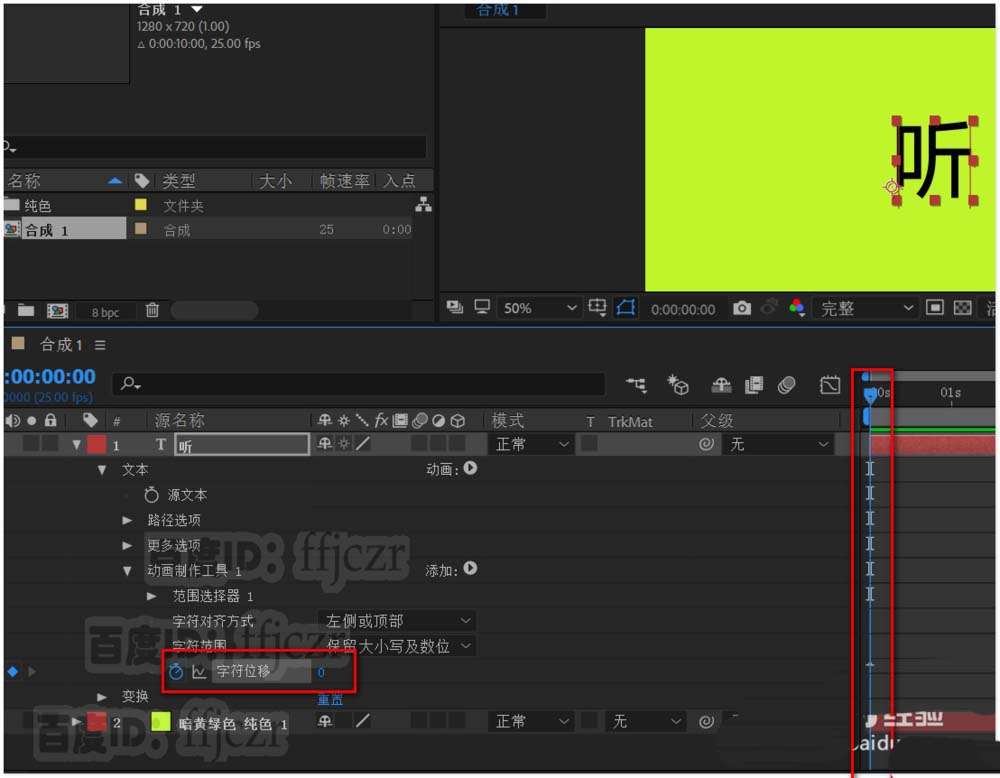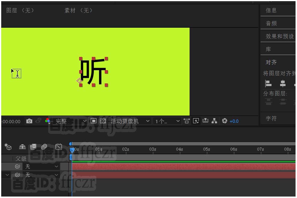 2、在合成层添加文本层,在显示区输入文字“听”,并将其居中于显示区。