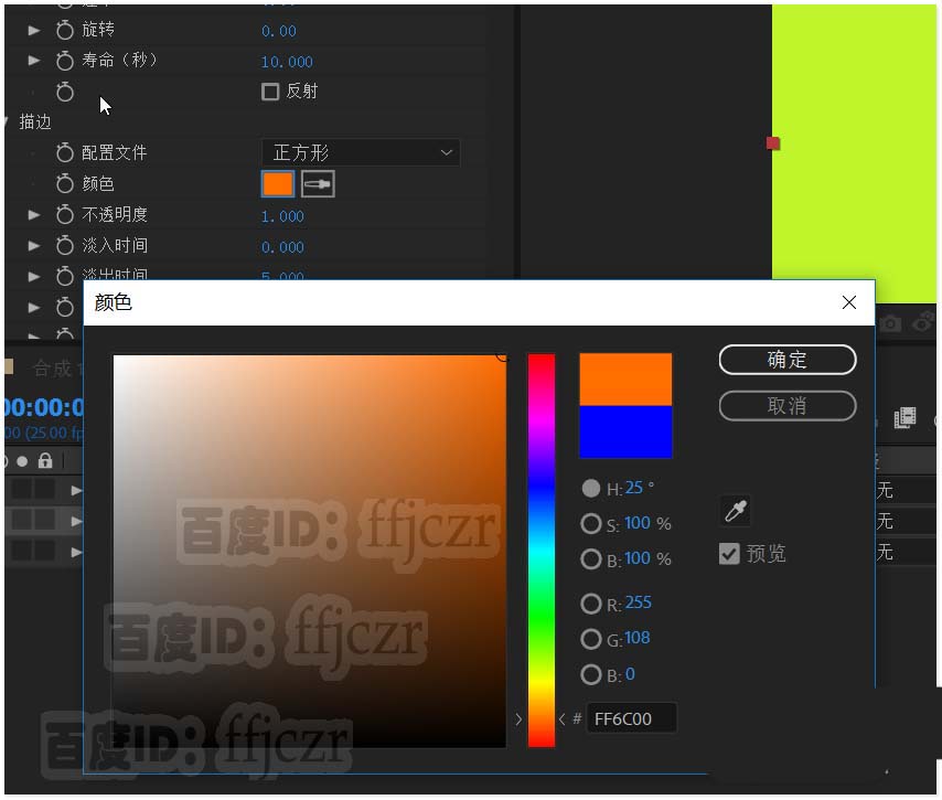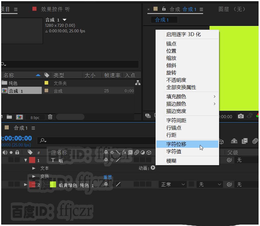1、新建一个合成项目,分辨率为1280*720;方形像素,25帧率。在合成层中新建一纯色层,作为该合成的背景(颜色为黄色)。