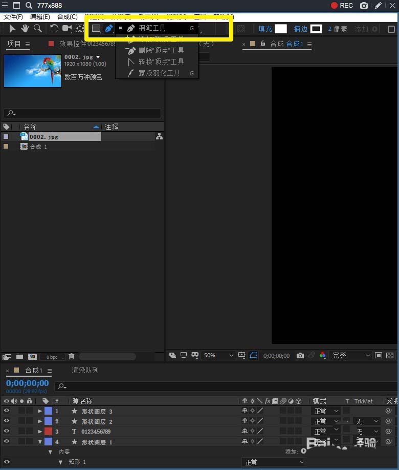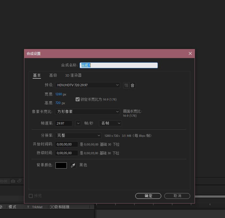 3、在“新建合成”对话框中可以设置视频的分辨率、视频的持续时间、视频的背景颜色、视频的帧速率,以及设置3d渲染器和合成的名称,然后点击确定