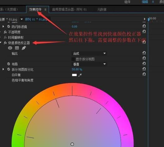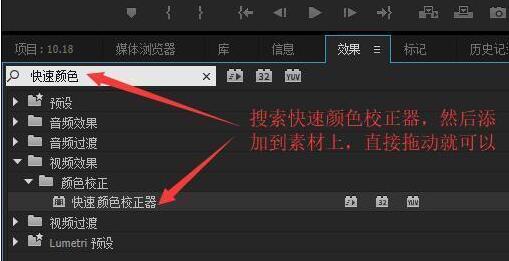 给视频添加一个效果,搜索“快速颜色校正器”,把这个效果添加到V1的素材上,
