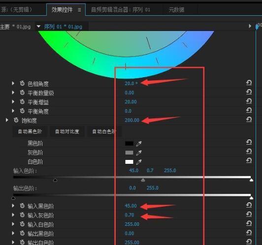 找到快速颜色校正器,如下图,方框里就是要修改的参数,其中色相角度改为20、饱和度改为200、输入黑色阶45、输入灰色阶0.7,