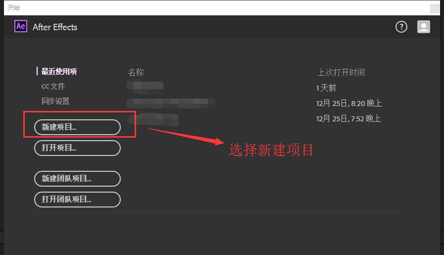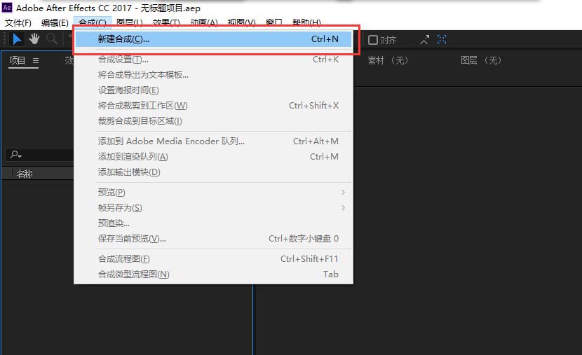 1、在启动AE2017版本的软件,在打开启动的AE界面中选择新建项目命令,单击新建项目新建一个AE工作项目。