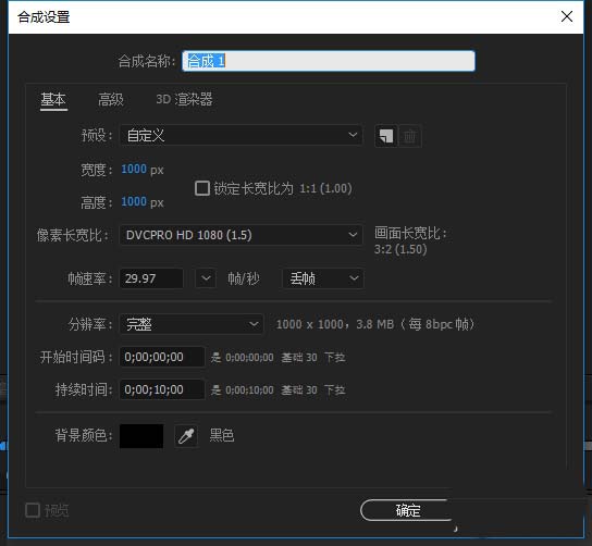 2、在新建的AE项目中选择合成菜单,在合成菜单中执行新建合成,然后新建合成设置窗口中设置合成的大小,背景颜色等属性。