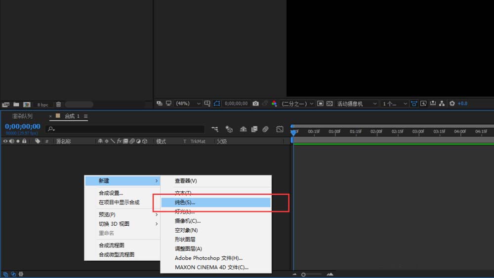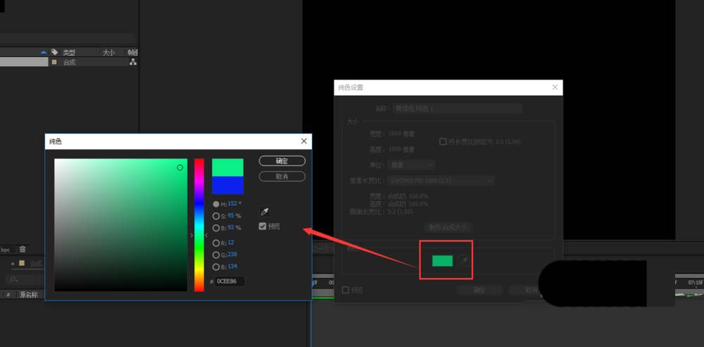 3、在AE的项目管理窗口右键,在右键中选择新建命令,在新建中选择纯色,然后在纯色设置窗口中单击颜色,弹出纯色选择窗口,选择好这个纯色图层的初始颜色。