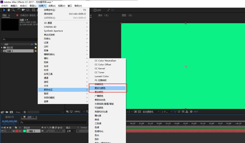 4、选中新建的纯色图层,在菜单栏中找到效果菜单栏,点开效果菜单栏,在效果中选择颜色校正,然后在颜色校正中选择“更改为颜色”效果。