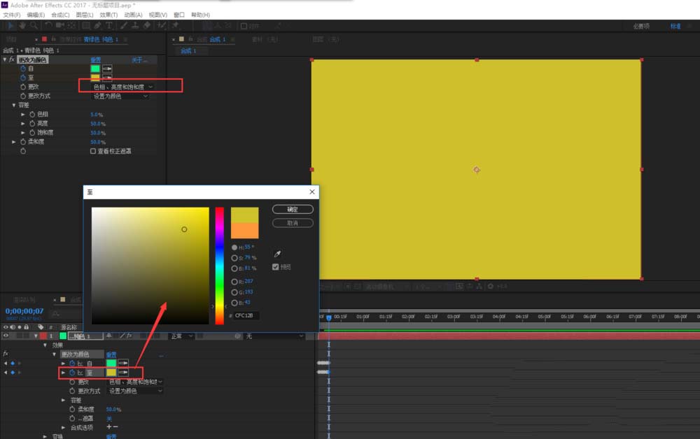 5、单击纯色图层的下拉小三角将纯色图层的效果设置全部展开,找到效果中的更改为颜色,将时间轴移到最开始的地方,在更改为颜色下面的“自”与“至”都打入一个关键帧,然后将“至”的颜色换一个颜色。