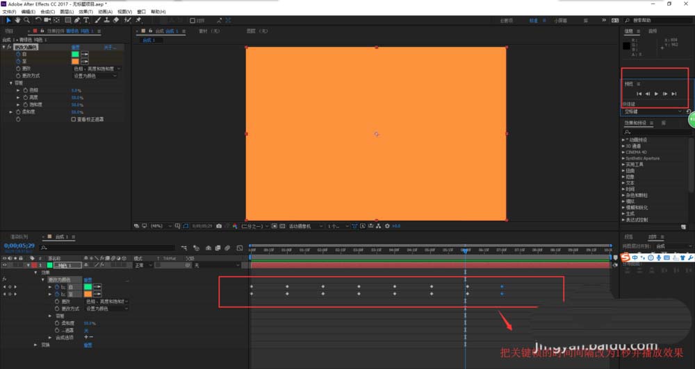 6、现将更改为颜色效果中的更改效果选择为“色相、亮度与饱和度”,然后按pagedown往后移动一帧,在“自”与“至”都打一个关键帧并更改颜色,重复操作,得到不同的多个颜色;选择这些帧,将这些关键帧的间隔时间改为1秒,然后播放预览动画效果,一个单个图层就实现了颜色变换的动画效果。