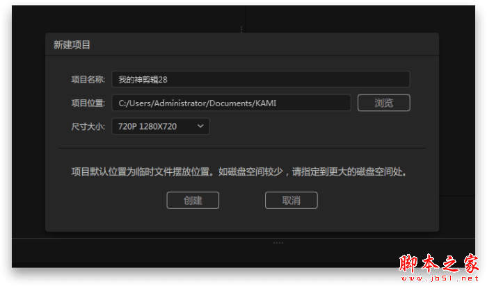 2、点击“新建项目”窗口,对新建项目命名、设置项目的保存位置和视频项目的视频尺寸。软件不允许用户在同个目录设置相同项目名称。默认位置一般为:C:/Users/Administrator/Documents/KAMI 。鼠标左键单击“浏览”设置项目保存的文件夹。