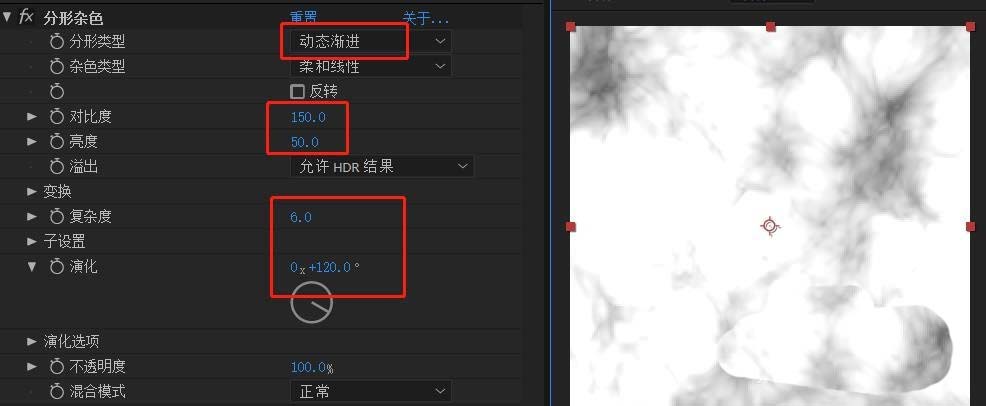 2、1-02为纯色层添加效果-杂色与颗粒-分型杂色,分型类型为动态渐进,对比度150,亮度50,演化120
