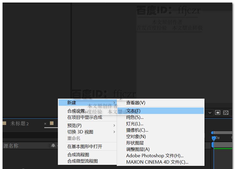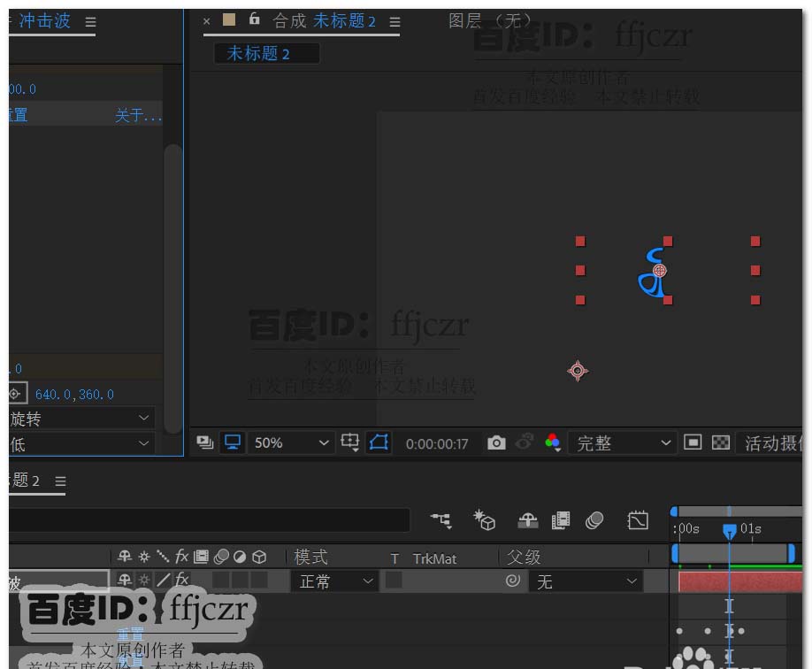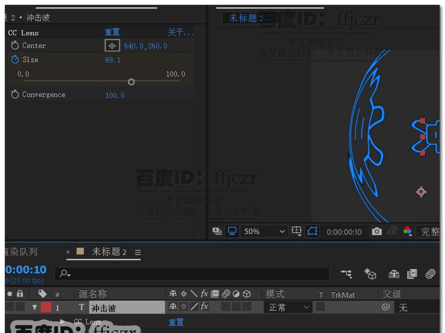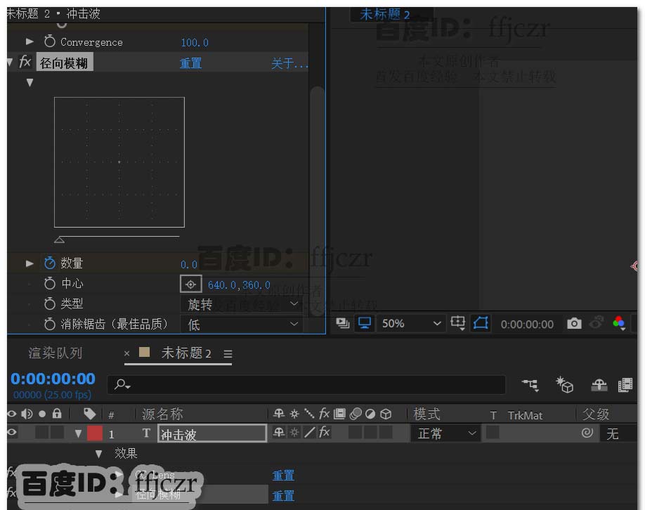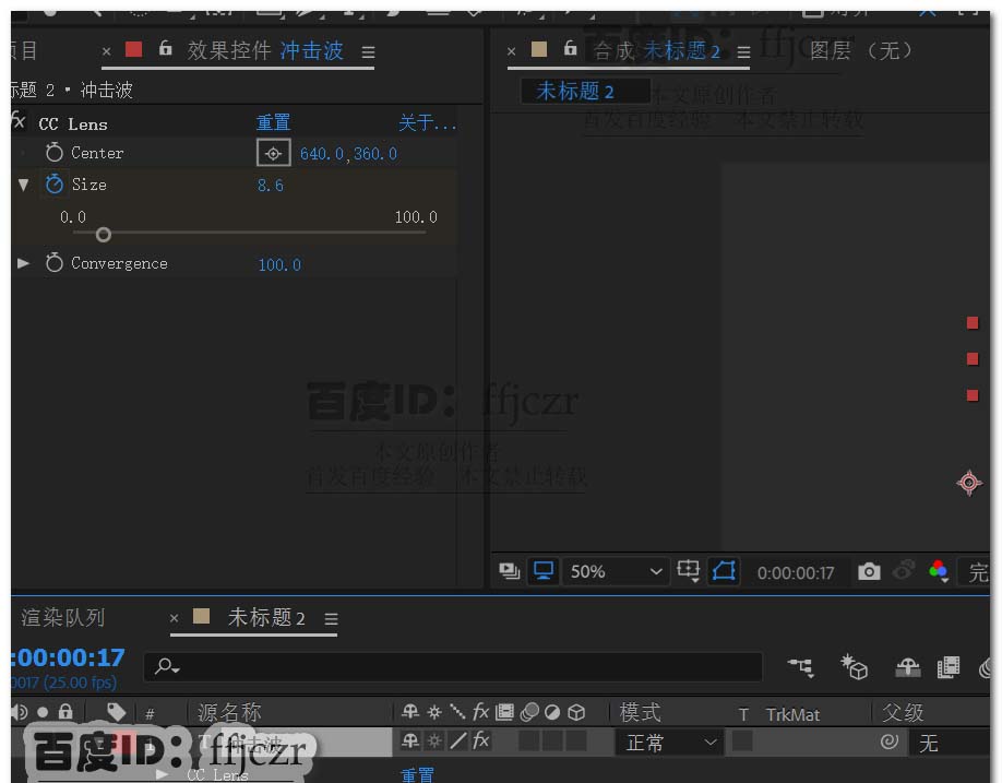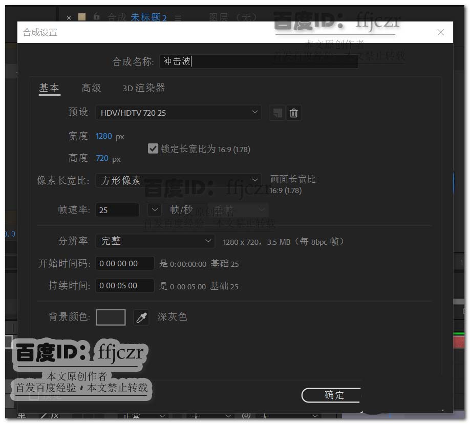 1、新建一个合成文件,命名为冲击波;1280*720,方形像素,帧速率为25,持续时间为5秒。