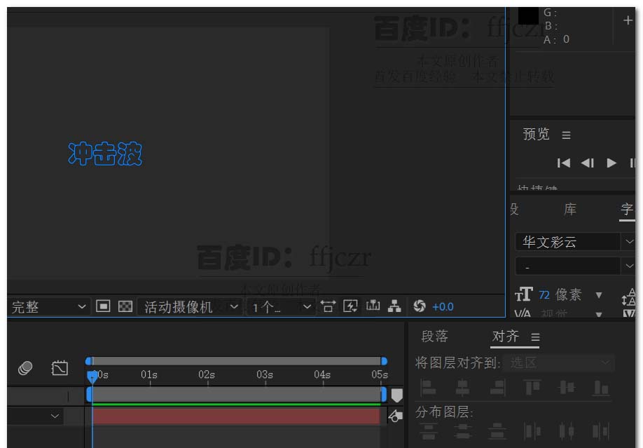 2、在合成层中添加文字层,输入文字“冲击波”,字体选用华文彩云,蓝色字。并将文字居中于显示区。