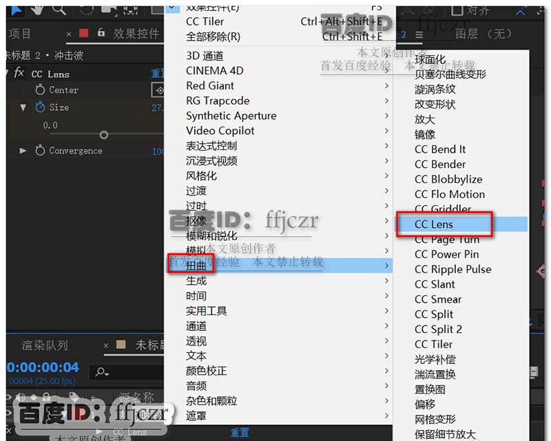 3、给文字层添加效果扭曲中的CC Lens。