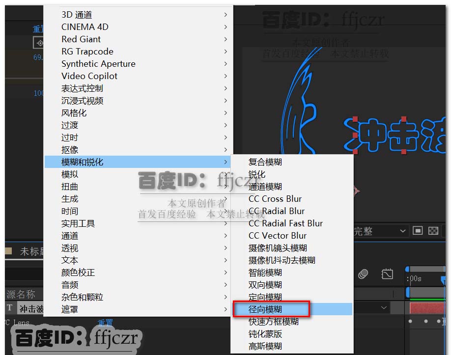 5、给文字层再次添加效果模糊和锐化中的径向模糊。