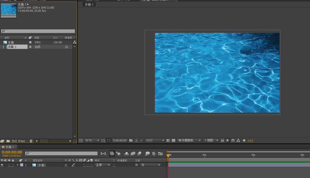 1、打开AE,拉入一张水面的图片,鼠标左键按住图片拖到新建合成,将这张图片新建个合成,并命名为水面
