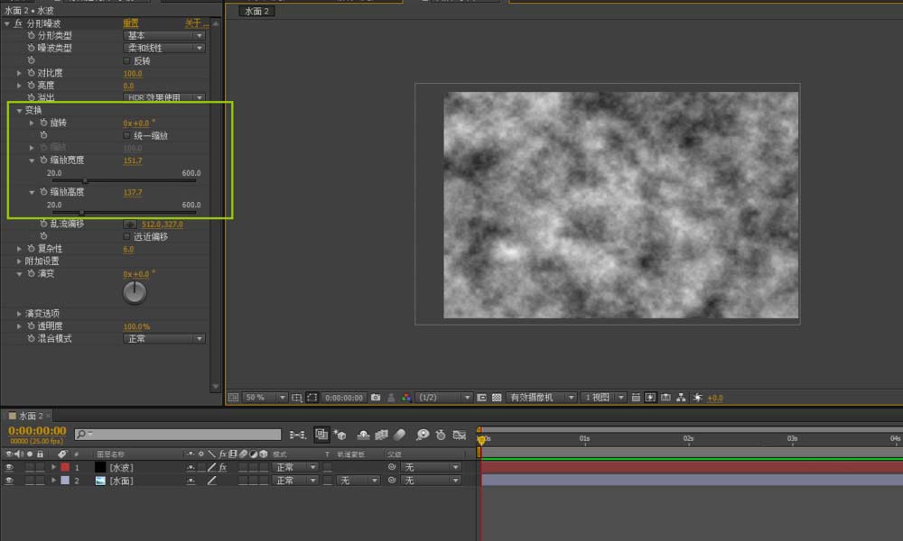 3、打开分形噪波的变换属性,点掉统一缩放,这样就可以单独调整固定层的长宽数值了,根据自己的感觉去调整对应的长宽。