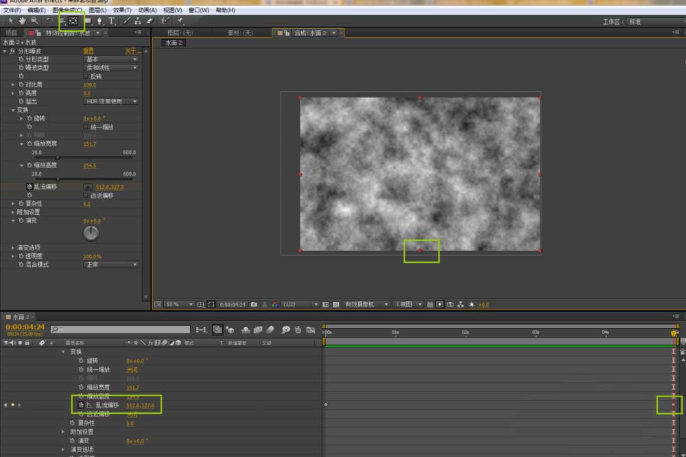 4、然后给乱流偏移在开始0s处K个关键帧,在最后一帧K个关键帧,同时将固定层的中心点利用锚点工具移至下方中点处