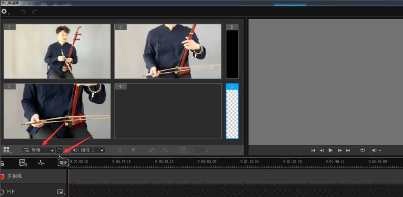 接着直接进入多机位剪辑功能界面,我们需要调整素材、使画面和音乐对齐,选择【音频】,然后点击【同步】,即可快速排列素材,
