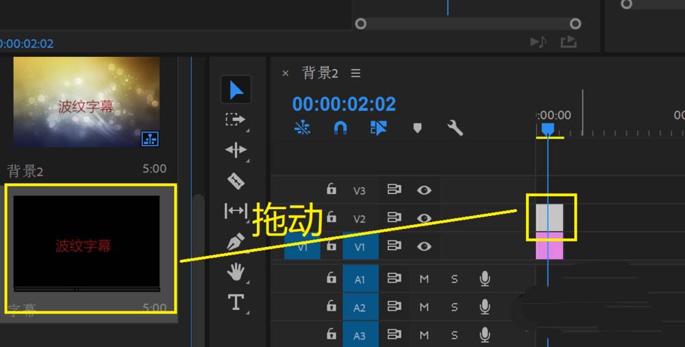 6、关闭字幕编辑窗口,然后在素材管理窗口中找到新建的字幕拖动到时间轴的视频轨道2中。