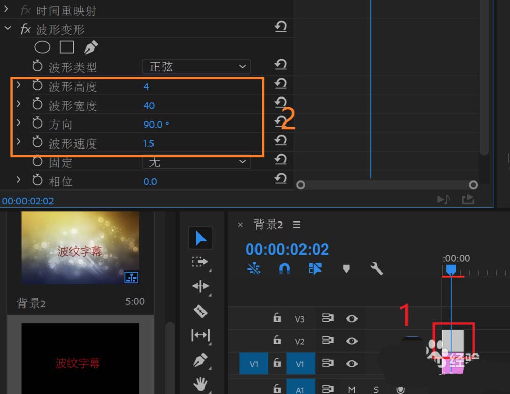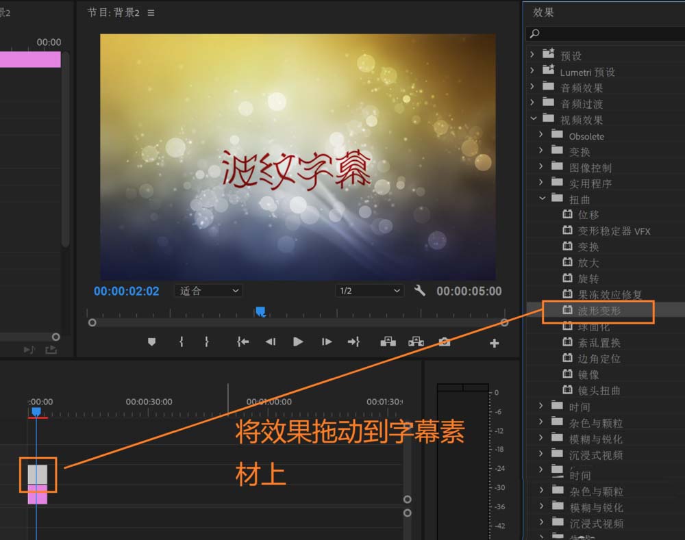 7、在视频效果中,找到扭曲,波纹变形,然后拖动到字幕素材上。