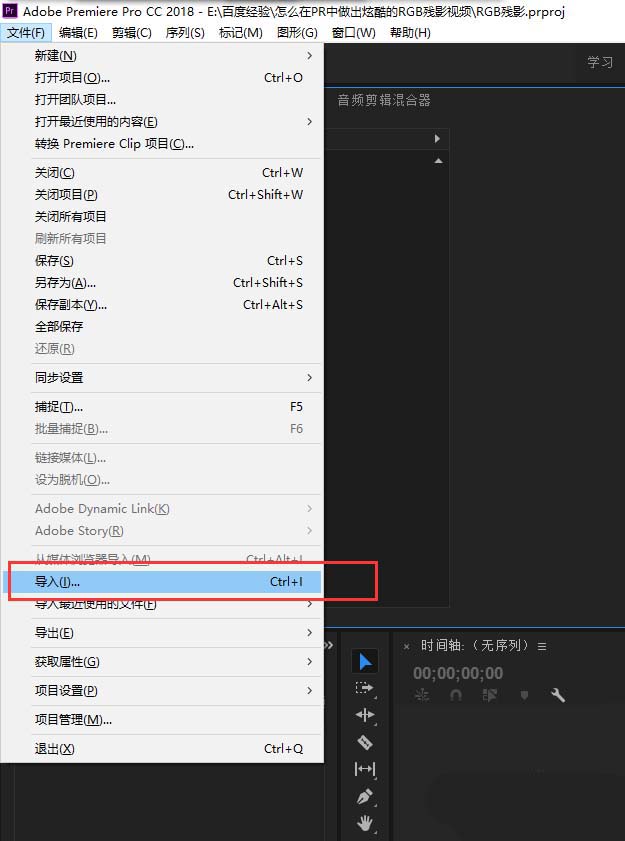 2、打开文件菜单栏,在文件菜单栏中有个导入命令,单击选择导入命令弹出素材导入窗口,选择一个视频素材导入到PR项目窗口中。