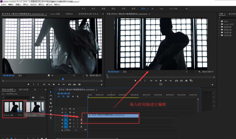 3、将导入的视频素材进行选中,按住鼠标左键不松将其拖入到时间轴窗口中创建序列并进行下一步的编辑操作。