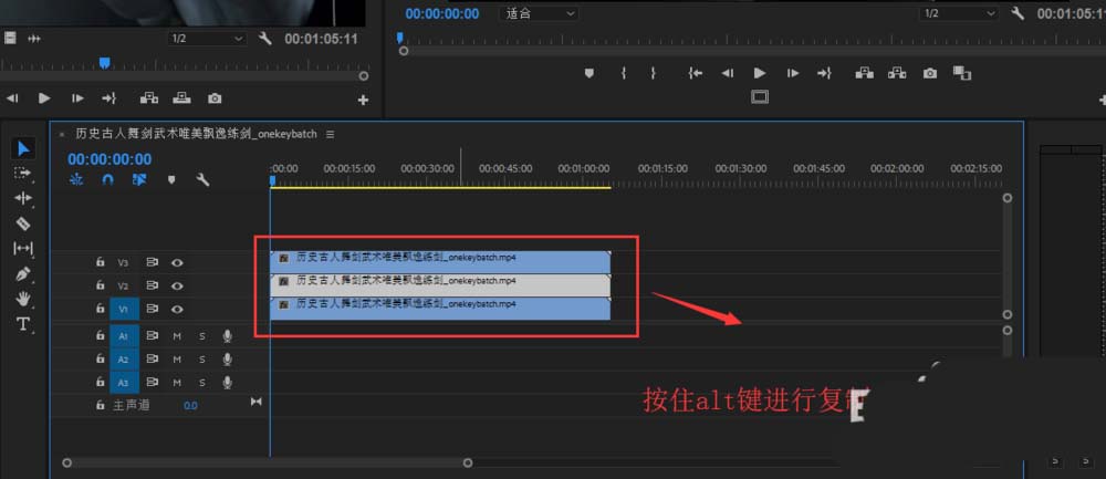 4、选中视频轨道1中的视频素材,按住键盘上的alt辅助键,将视频素材往视频轨道2与3上进行拖动,得到两个复制素材。