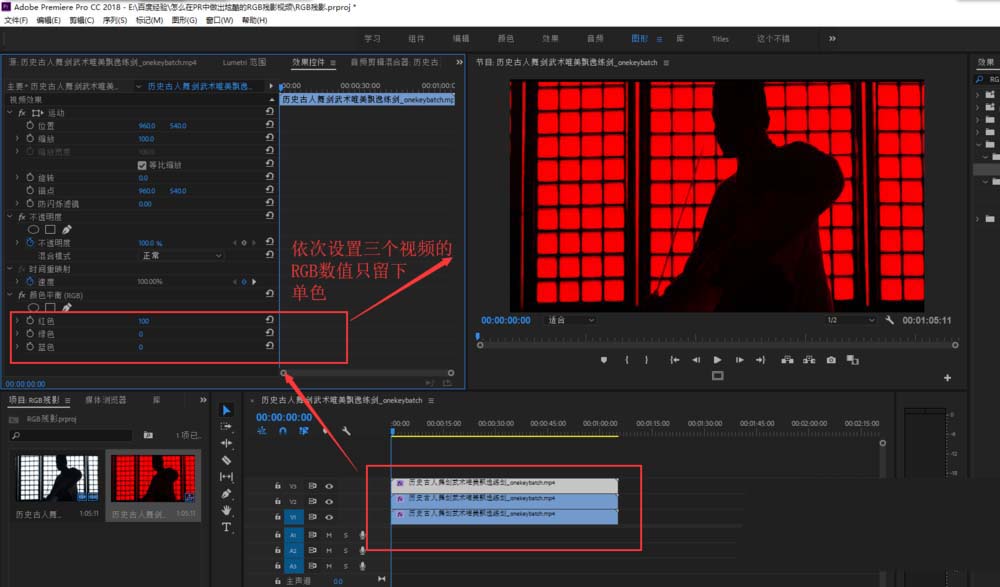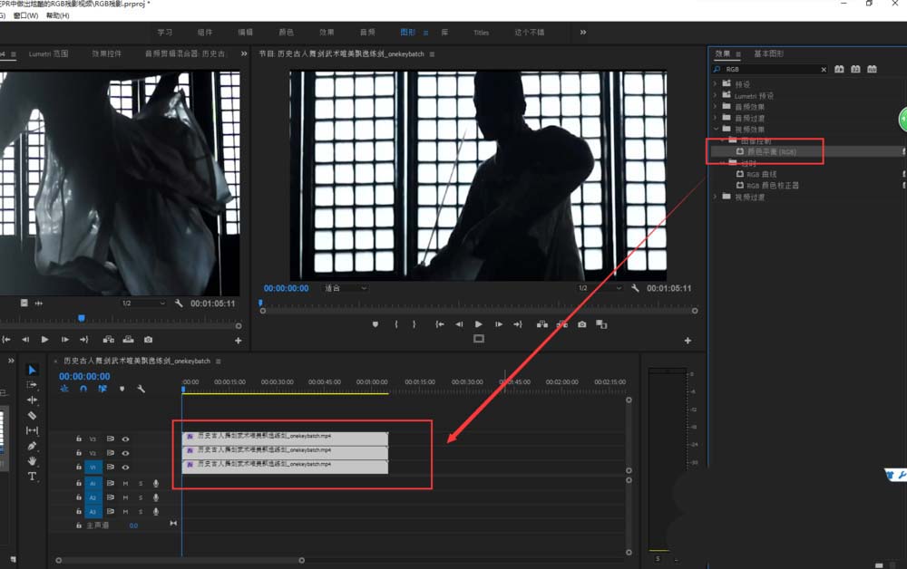 5、用鼠标框选住三个视频素材,在效果窗口中搜索“RGB”得到颜色平衡效果,并将该效果施加到三个视频素材上,然后依次选中三个视频素材,在效果控件中调整颜色平衡的RGB数值,分别将三个视频设置成R,G,B三种颜色对应的单色。