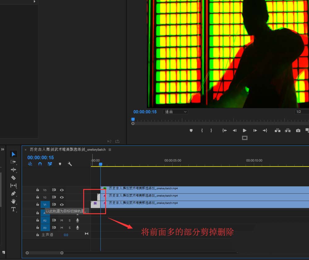 7、将三个视频前方错位多出的剪掉删除,最终播放视频,一个RGB残影的视频效果就出现了。