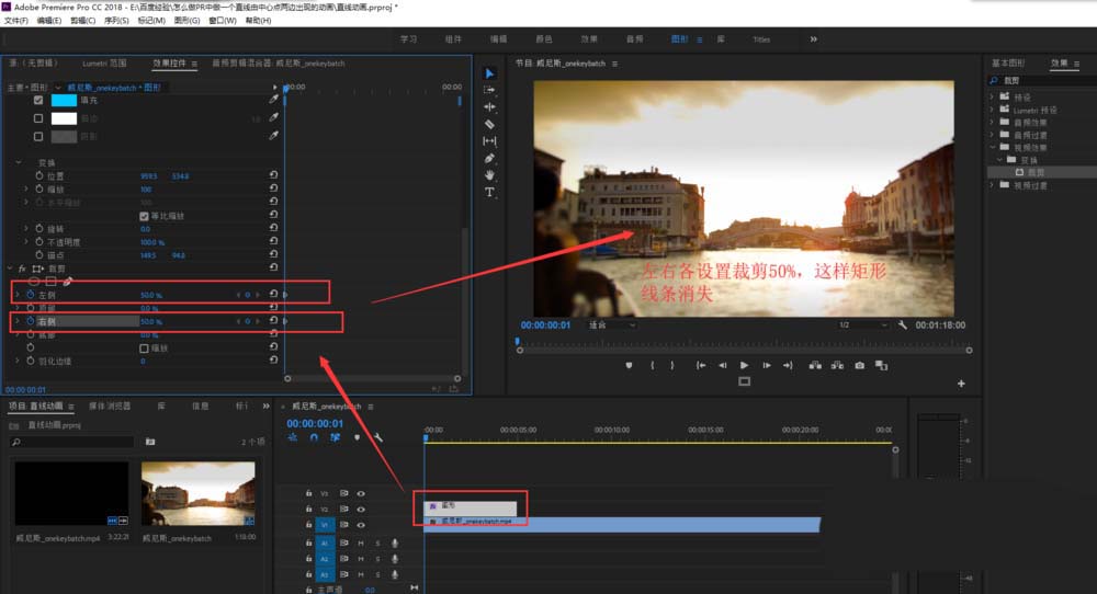 6、选中图层,打开效果控件,找到裁剪效果,在裁剪的左侧与右侧各打入一个关键帧,并设置数值都为50%,这样线条就消失了;然后在隔几帧,在设置左侧与右侧的数值为20%。播放视频,一个线条由中心两边出现的动画就出现了。