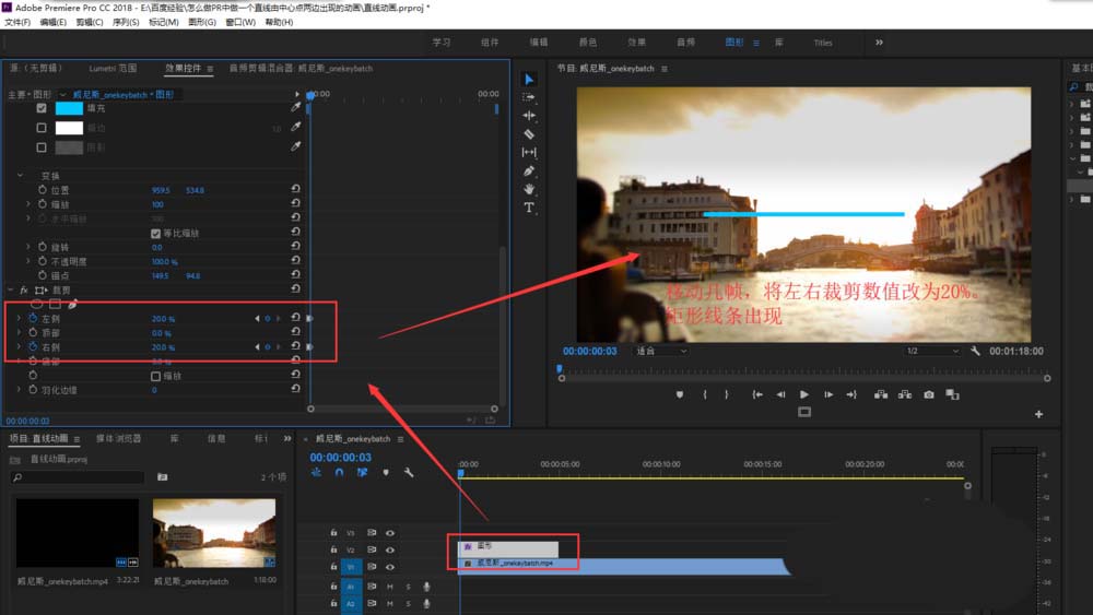 3、单击矩形之后,PR页面中会出现一个矩形,我们选中该矩形,调整属性与长宽,使得这个矩形变成一个线条。