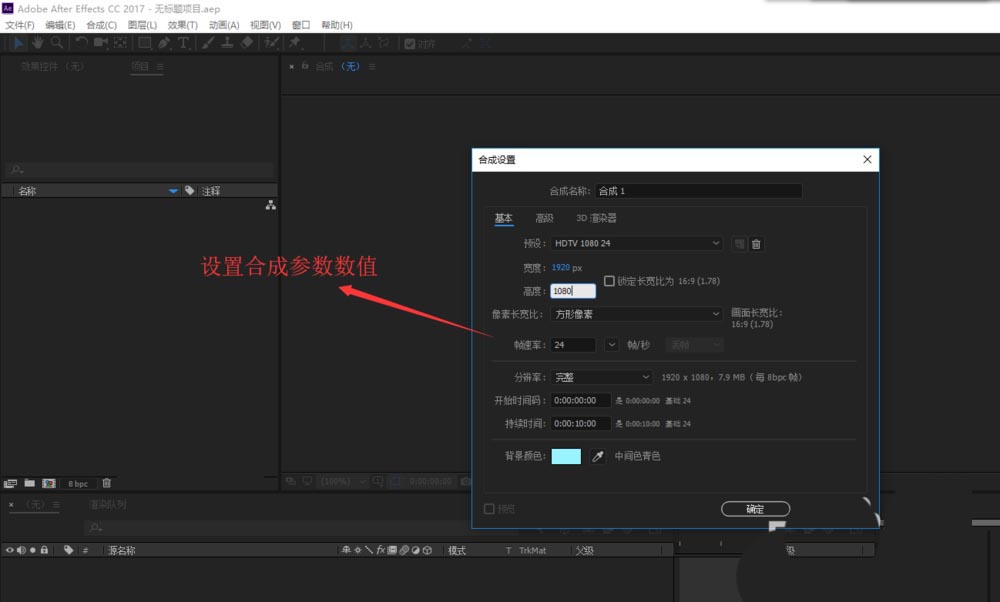 1、进入到AE编辑界面之后,按键盘快捷键Ctrl+N执行新建合成命令,弹出合成设置对话框,在这个对话框中设置好合成的参数。