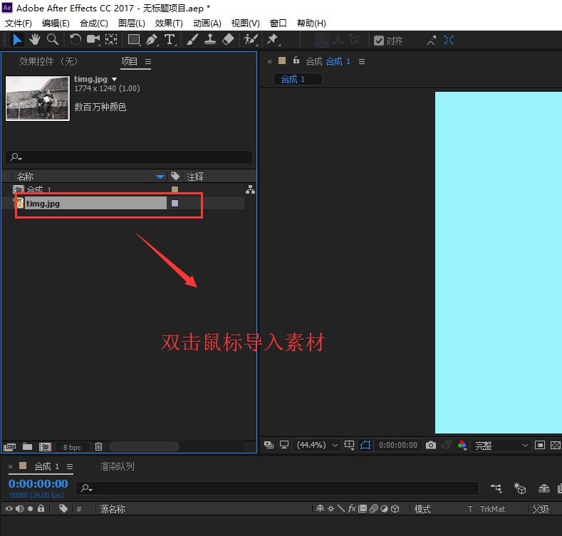 2、在AE的项目窗口的空白处双击鼠标左键,会弹出导入素材对话窗口,在该窗口中找到素材图片并导入到项目窗口中。
