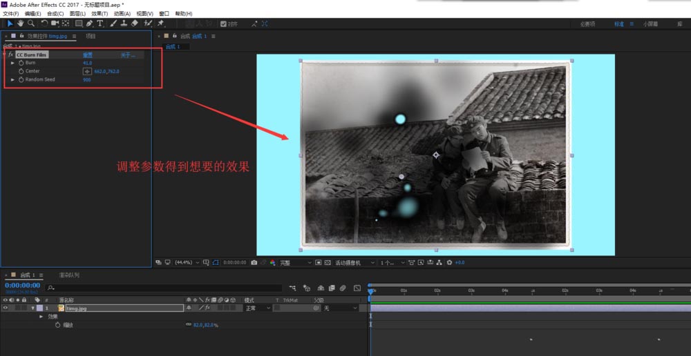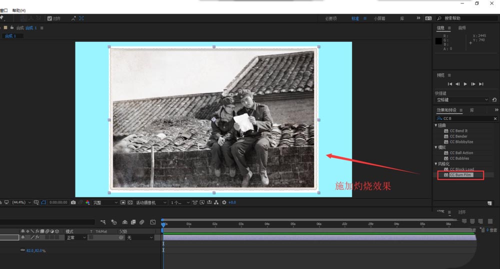 5、选中素材图层,打开效果控件窗口,在效果控件中找到CC Burn Film效果并设置调整该效果的三个参数,得到你想要的一个灼烧效果。