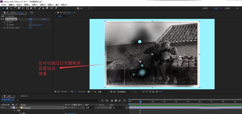 6、经过上一步的设置我们只是得到一个静态的灼烧效果,我们还可以通过打入关键帧的方法制作出动态的灼烧过渡效果。