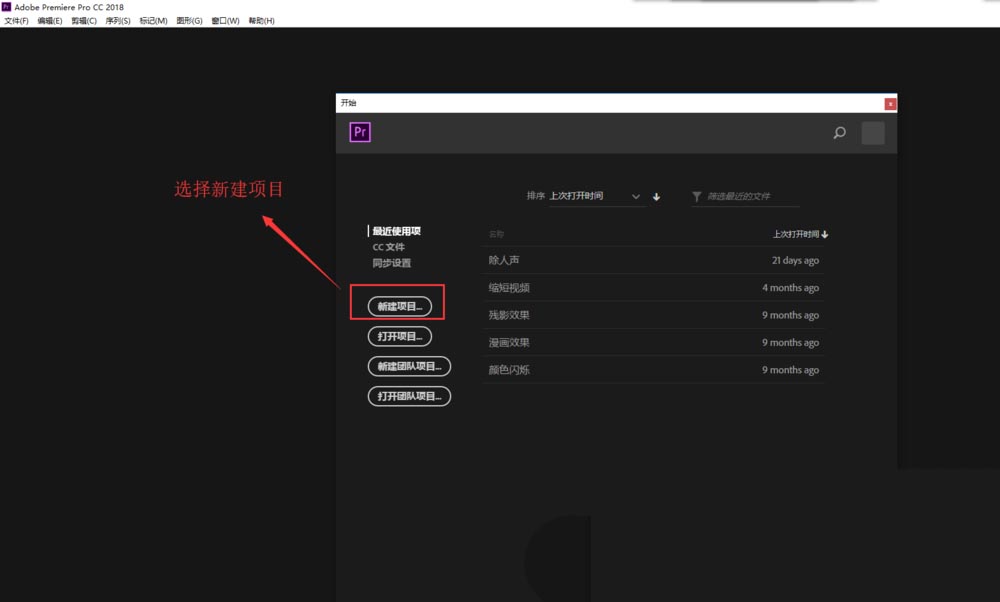 1、双击Premiere剪辑软件的快捷图标,启动打开PR软件,然后在开始对话框页面上选择单击“新建项目”命令。