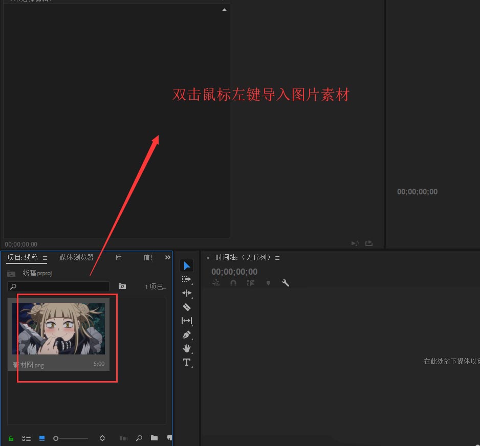 3、设置好项目之后,找到项目素材管理窗口,在项目素材管理窗口的空白处双击鼠标左键导入素材,将我们的图片素材导入到PR中。