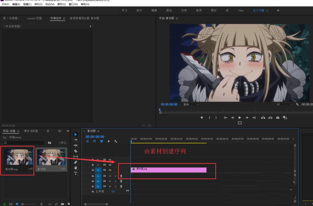 4、选中导入的图片素材,按住鼠标左键不松将其拖动到时间轴窗口中单击鼠标,由这个图片素材来创建一个剪辑序列,并自动将图片素材置于视频轨道1上。