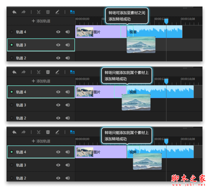 ①、转场是同一轨道中两个相邻素材之间的过渡或转换,可添加到两个素材之间,则是转场添加成功;如果转场只能添加到相邻素材的某个素材上,这就是添加转场失败的情况,如图1所示。