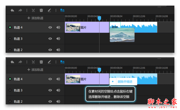 ②、如果相邻素材之间有空隙,则会添加转场失败,解决办法是在素材间的空隙处点击鼠标右键,选择“删除并缩进”,删除该空隙,如图2所示。