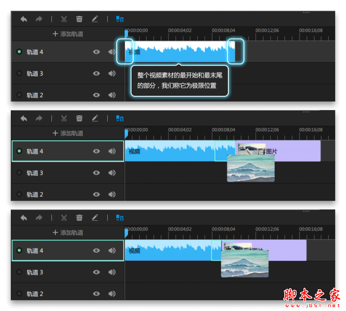 ③、整个视频素材的最开始和最末尾的部分,我们称它为极限位置。在极限位置和其他素材也是会添加转场失败,解决办法是切割掉视频素材的极限位置即可,如图3所示。