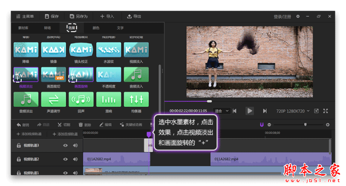 通过播放发现水墨的方向和位置不太对。选中水墨,点击效果,点击画面旋转以及视频淡出的“+”,如图11所示。