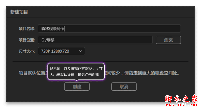 2.双击神剪辑图标,点击新建项目,选择项目存放路径,以及命名该项目,尺寸大小按默认设置,点击创建,如图2所示。