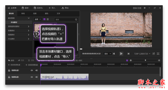 双击本地素材窗口,选择存放在电脑的视频素材,点击导入,再次双击本地素材窗口,导入找好的水墨素材;选择视频轨道1,点击拍摄素材的“+”,素材导入视频轨道1。