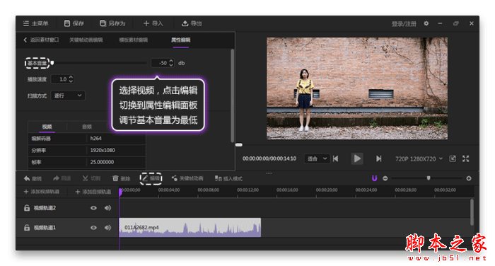 选择轨道1素材,点击编辑,切换到属性编辑,调节视频基本音量为最低。