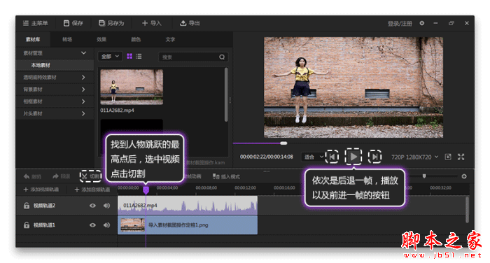 4.找到两次跳跃的最高点切割视频。点击播放按钮,找到人物第一次跳跃的最高点,也可以通过点击播放按钮旁边的两个按钮,后退一帧和前进一帧按钮,更加精准的选择人物跳跃的最高点,然后选中视频,点击切割,然后继续寻找第二次跳跃的最高点,在最高点处点击切割,如图7所示。选中轨道2中间的视频片段,点击删除,如图8所示。